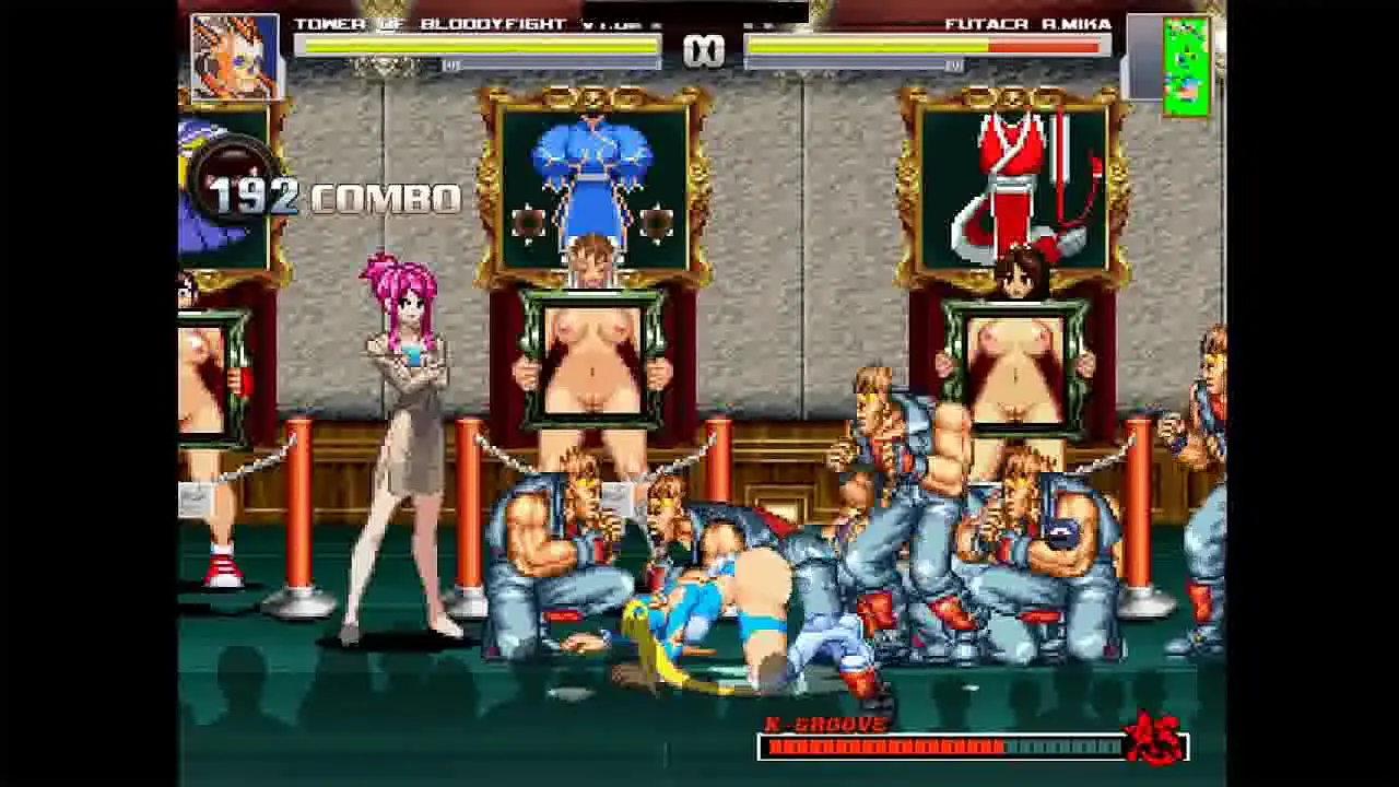Blonde hentai game character Rainbow Mika is surrounded by a group of guys. She gets bent over and fucked intense in doggystyle. They take turns pounding her, making her moan as they fill her with their cum.